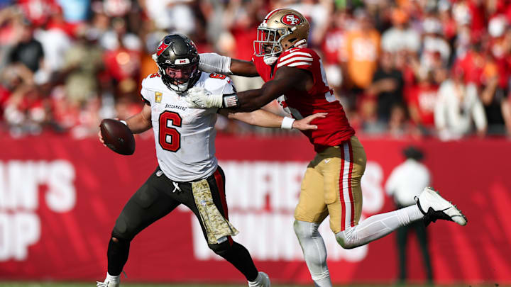 Mayfield didn’t look like his usual self and threw for 116 yards and one touchdown in the Bucs’ 23-20 loss. On one play late in the fourth quarter, though, Mayfield single-handedly helped keep Tampa Bay in the game. Chased down by 49ers’ Nick Bosa who was tugging at his left arm, Mayfield scrambled to the sideline and connected with Rachaad White on a clutch fourth-down conversion.