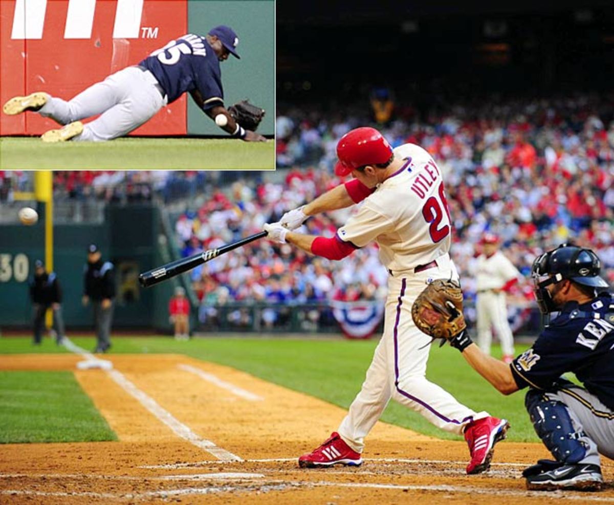 Chase Utley's two-run double slipped out of Mike Cameron's glove as the Phillies took a 3-0 lead in the third inning and Cole Hamels dominated the Brewers in a 3-1 victory, helping the Phils to their first postseason victory since Game 5 of the 1993 World Series.