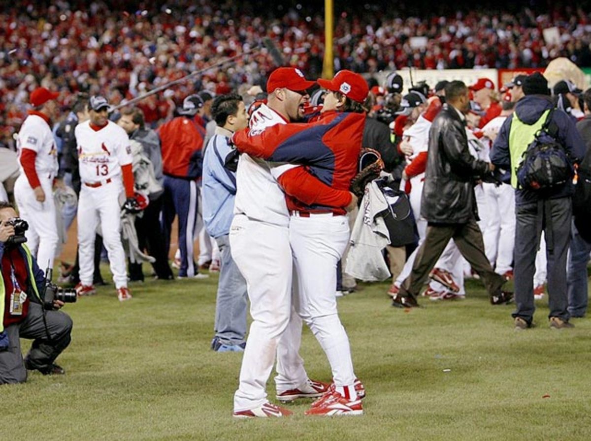 Manager Tony La Russa hugs Albert Pujols after winning Game 5 and the World Series over the Detroit Tigers in 2006. Pujols won Rookie of the Year and three MVPs during his 11 seasons in St. Louis.