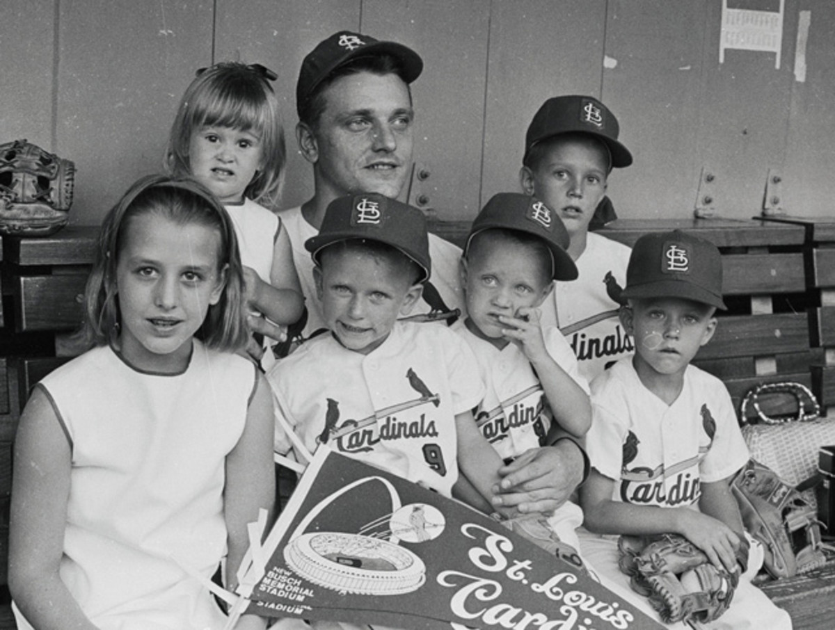 Maris sits with his six children before a father-son game at Busch Memorial Stadium in St. Louis. Maris played his final two seasons with the Cardinals and was part of their 1967 team that won the World Series.