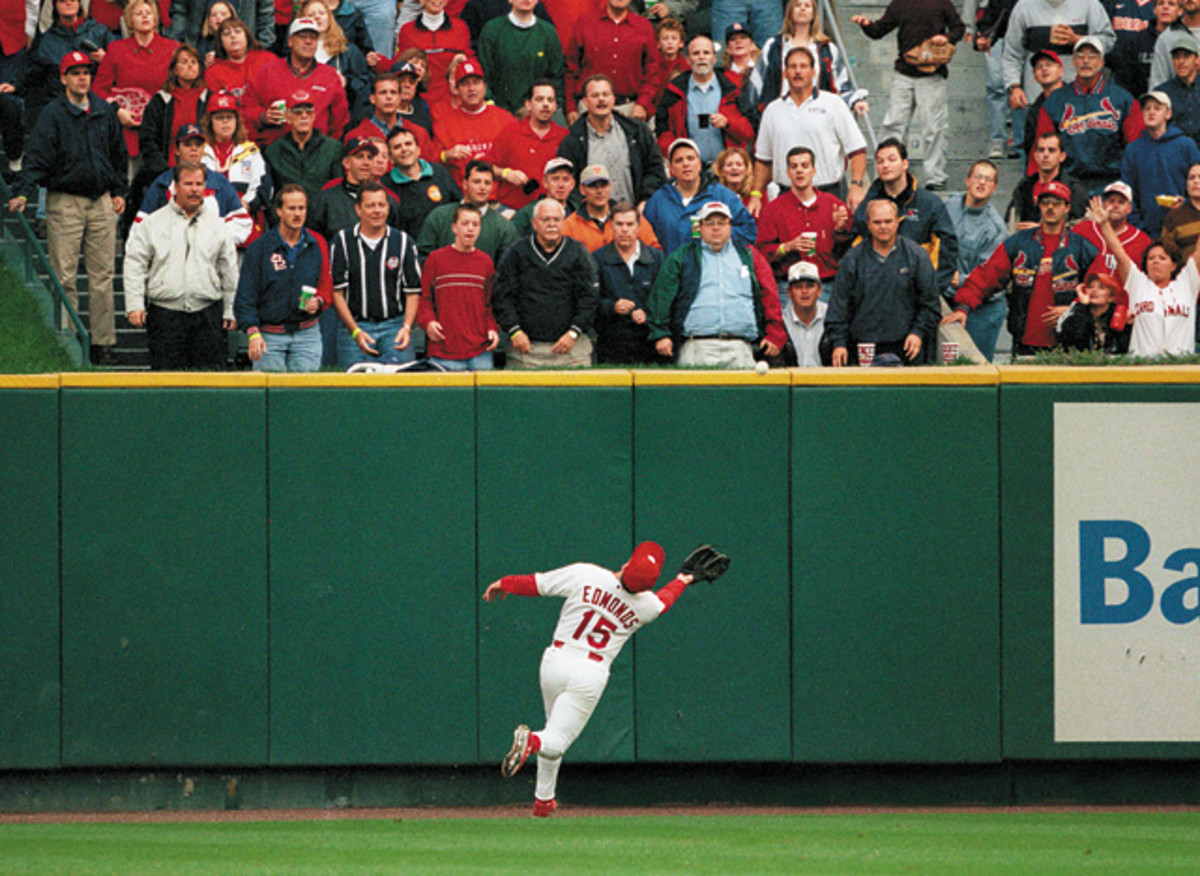 Edmonds makes an over-the-shoulder catch against the Atlanta Braves in the NL divisional playoffs, a series the Cardinals lost in four games. Edmonds was an eight-time Gold Glove award winner and part of the Cardinals 2006 World Series championship team.