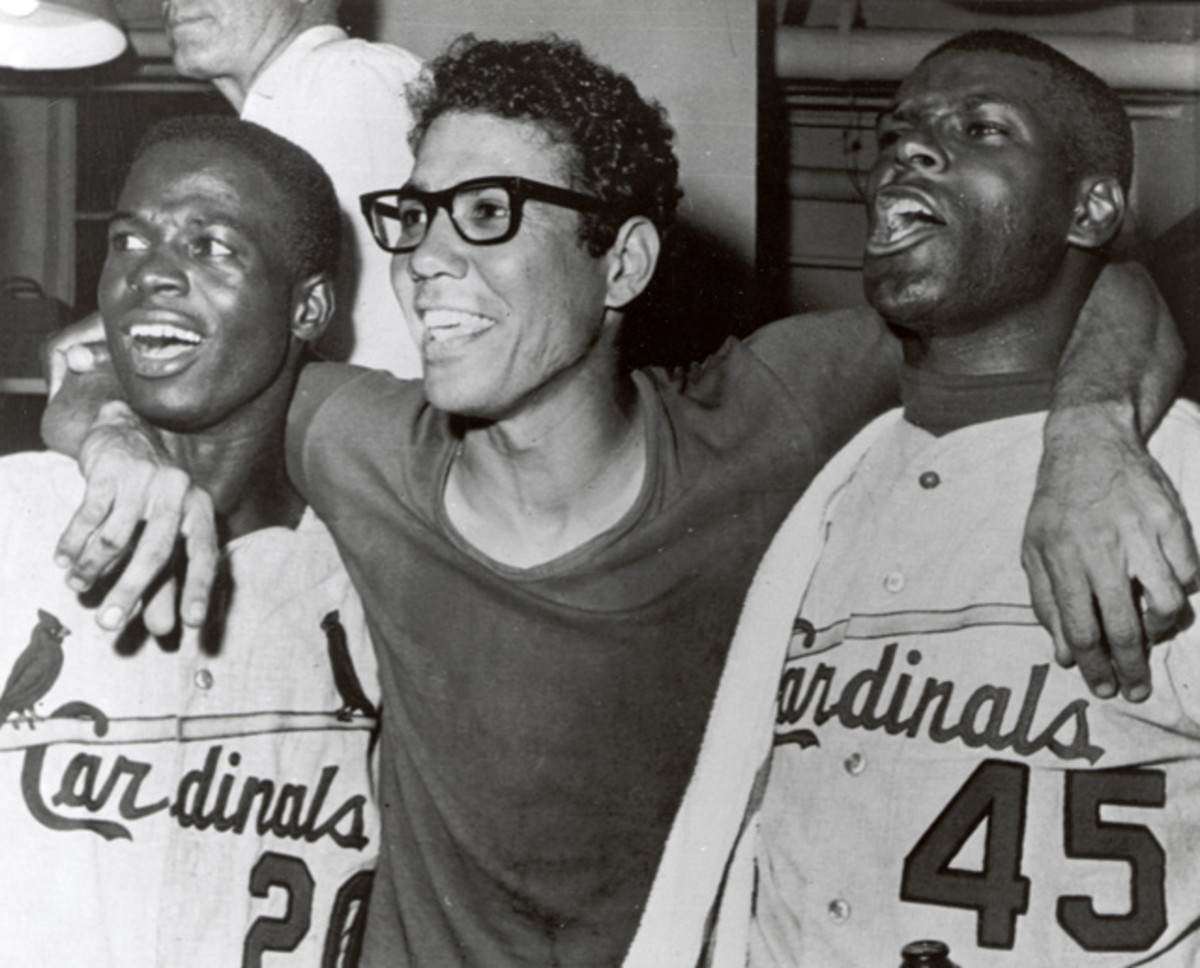 The trio of Cardinals celebrates after beating the Red Sox in seven games to win the 1967 World Series. Brock and Gibson are members of the Hall of Fame.