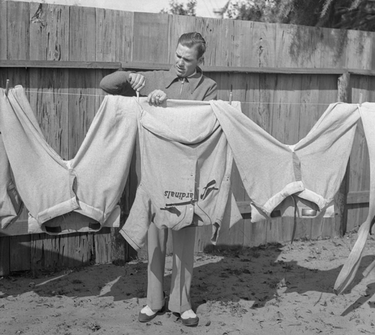 Dean hangs his uniform out to dry after a spring training workout. The Hall of Fame pitcher was part of the 1934 Cardinals' World Series-winning team and was named NL MVP the same year.