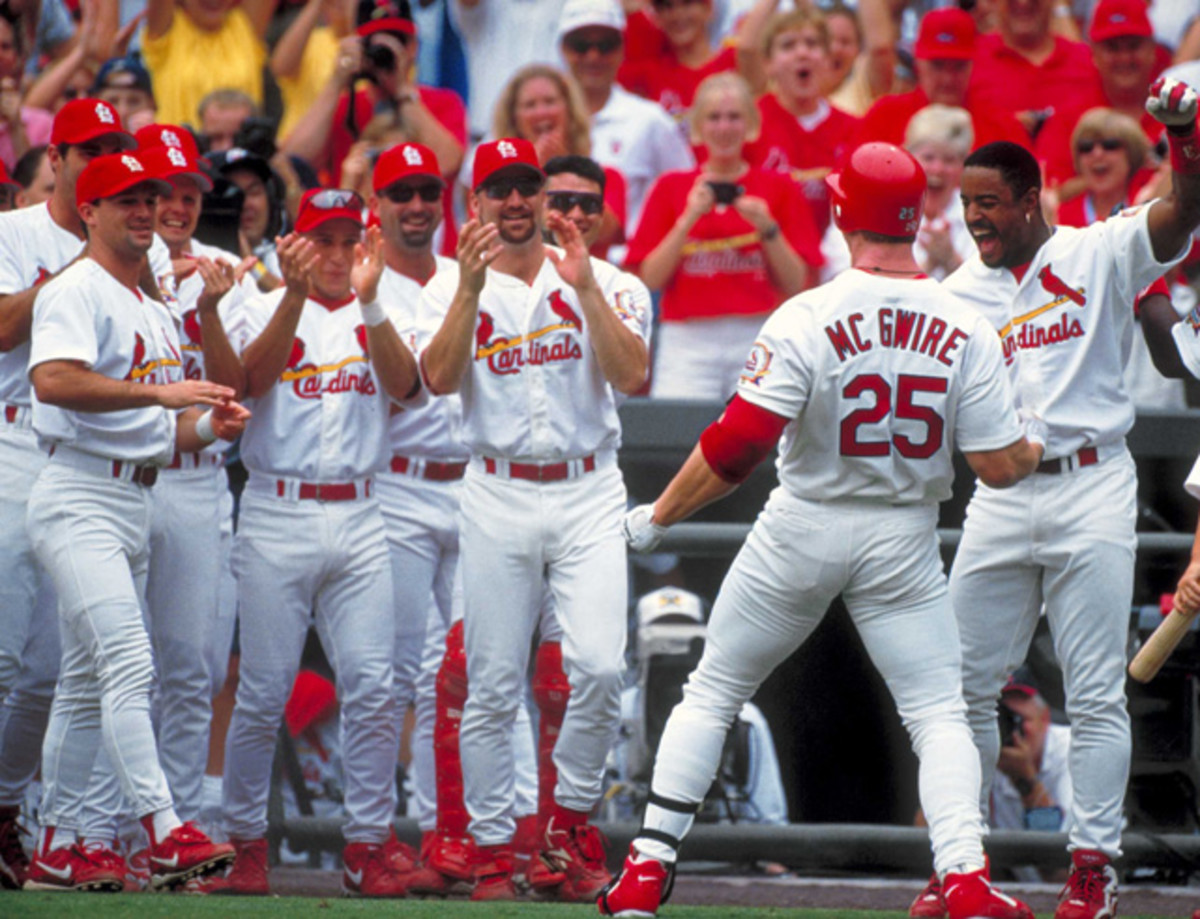McGwire celebrates with his teammates after hitting his 61st home run to tie Roger Maris for the single-season record. McGwire would hit 70 home runs in 1998, a record that stood until Barry Bonds blasted 73 in 2001.