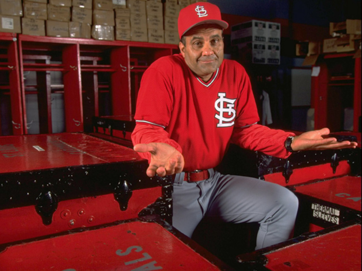 Joe Torre doesn't seem to know why he's alone in the locker room during this 1995 photo shoot. Torre played for the Cardinals from 1969 to 1974 and won the 1971 NL MVP. He was less successful during his six seasons as a St. Louis manager, when the Cardinals never made the playoffs.