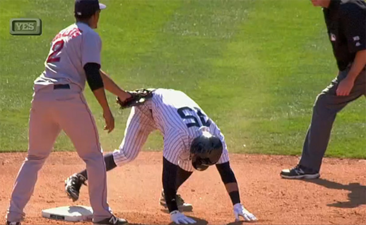 However, Red Sox shortstop Xavier Bogaerts kept the tag on Anna's hip as Anna stood up, a process during which Anna briefly came off the bag. Boston manager John Farrell asked the play to be reviewed based on broadcast replays that showed indisputable evidence that Anna should have been called out. However, according to Major League Baseball, the replay umpires in New York didn't have immediate access to the definitive angles and thus allowed the call on the field to stand.