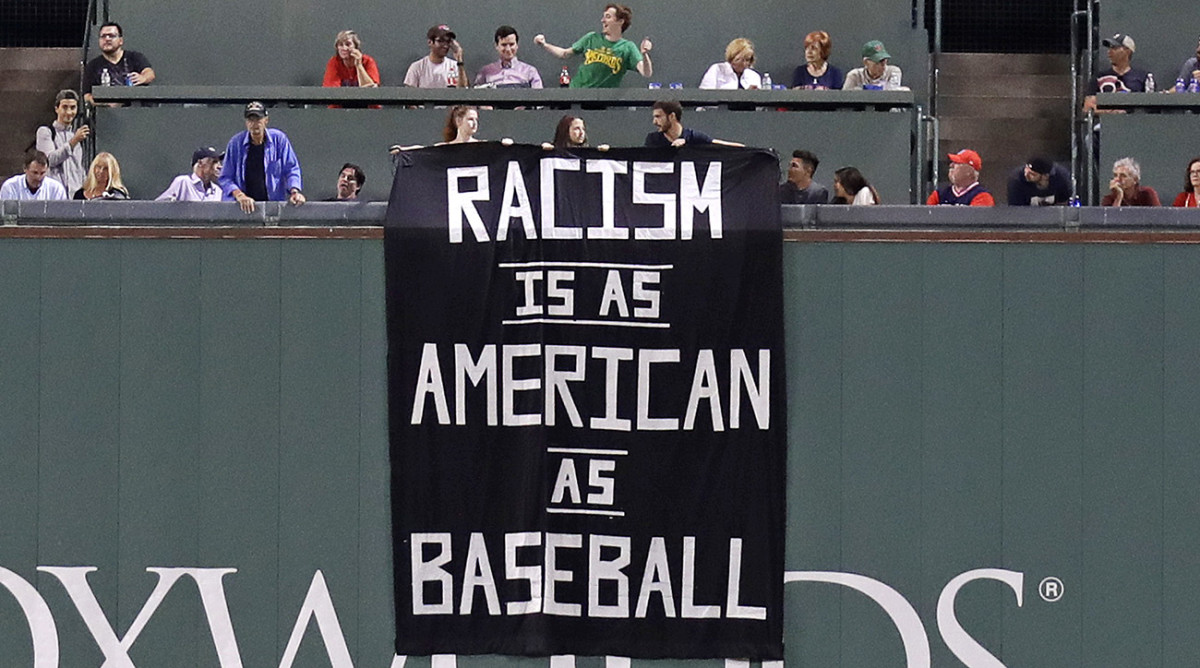A bold message displayed on the Green Monster interrupted the fourth inning of a sleepy A’s-Red Sox game Wednesday night. “RACISM IS AS AMERICAN AS BASEBALL,” declared the tall black-and-white banner unfurled by four fans, who were removed by security from the stadium immediately thereafter.