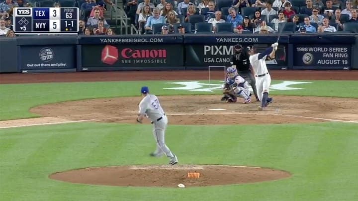 In the bottom of the fifth inning, Stanton hit a solo shot off of Rangers starter Ariel Jurado, sending the ball a projected 449 feet. The home run was Stanton's 28th of the season and gave the Yankees an insurance run with a 6-3 lead.