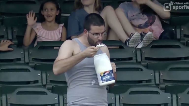 Man Keeps Eating From Giant Mayo Tub at Minor League Game