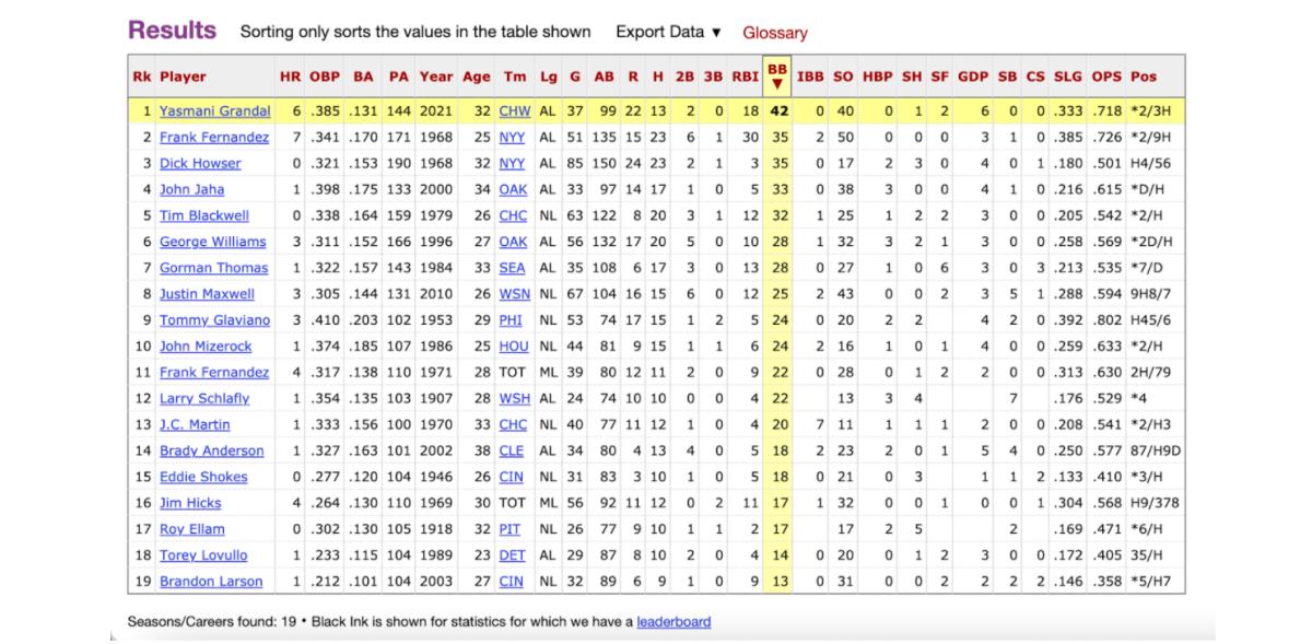 This is odd not just this year but historically. No player has ever been able to draw walks so frequently while hitting so little. So where do you have to look to find anything even remotely in the same ballpark as this? And how is Grandal making it work?