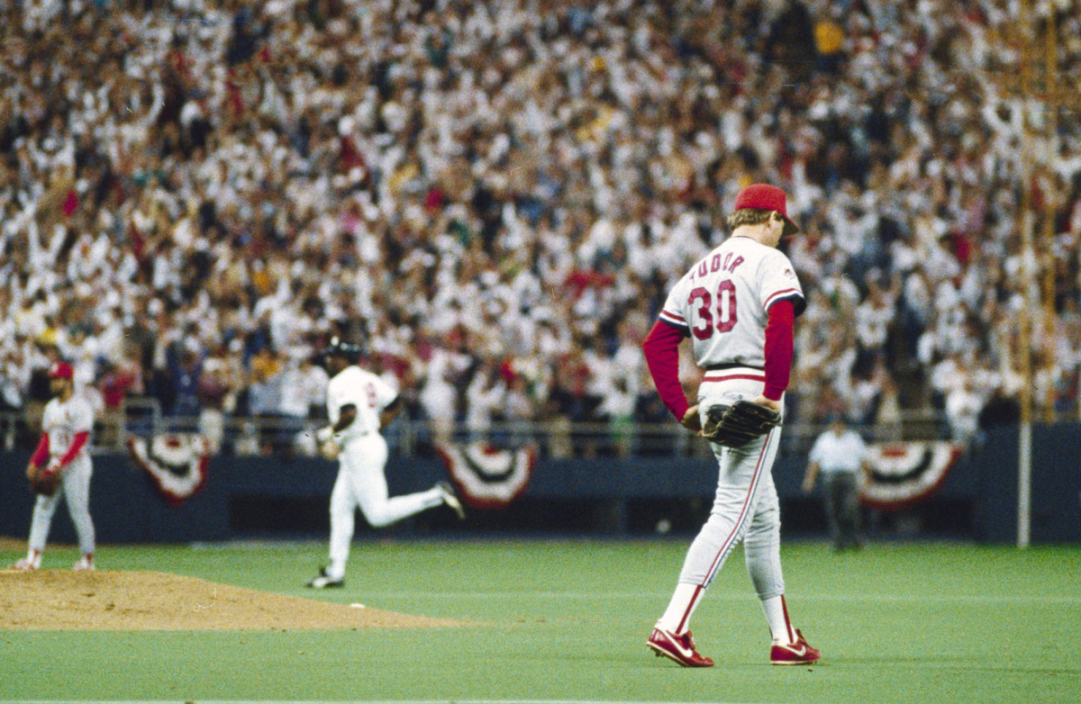 What a bizarre juxtaposition of styles. The Twins played in a bandbox and did nothing but hit home runs (they were 10th in the league in batting average but third in slugging percentage). They had two good pitchers—Frank Viola and Bert Blyleven—and nothing else. (Those two started nine of the Twins’ 12 postseason games. I’ll give you five bucks if you can name the guy who started the other three*.) Minnesota is the rare team that made the World Series with a negative run differential: Its expected won-loss record was 79–83.