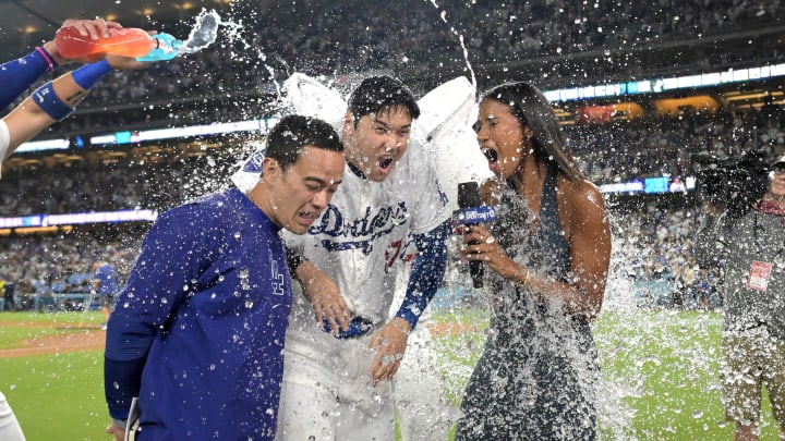 At the end of Ohtani’s historic night, he met with sideline reporter Kirsten Watson for a postgame interview. His Dodgers teammates decided to surprise him with a well-deserved Gatorade shower, causing Ohtani to let out a hysterical scream.