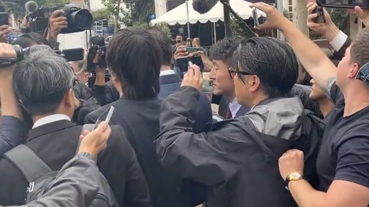 When Mizuhara arrived at the courthouse on Tuesday morning there was a media mob waiting and they had not dispersed by the time he left. Mizuhara did not end up making any remarks or respond to any of the questions that were shouted at him, but that didn't stop the assembled press from trying to get a comment.