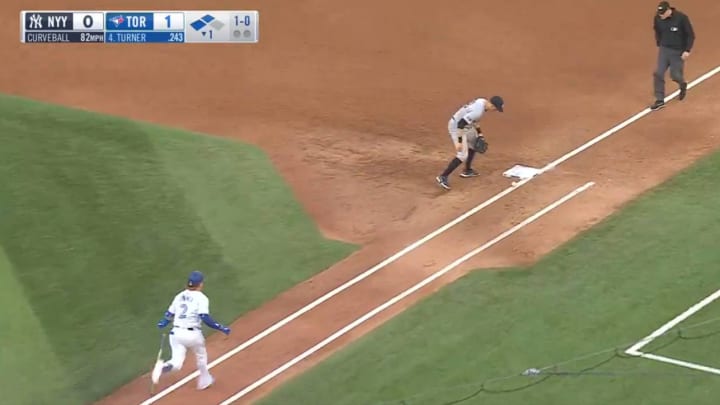 Rice, who could’ve easily scooped the ball up to get the easy out, let it go to see if it would roll foul. To the 25-year-old’s horror, the ball would bounce off the first base bag, allowing Turner to reach first and Blue Jays’ Isiah Kiner-Falefa to score from third.