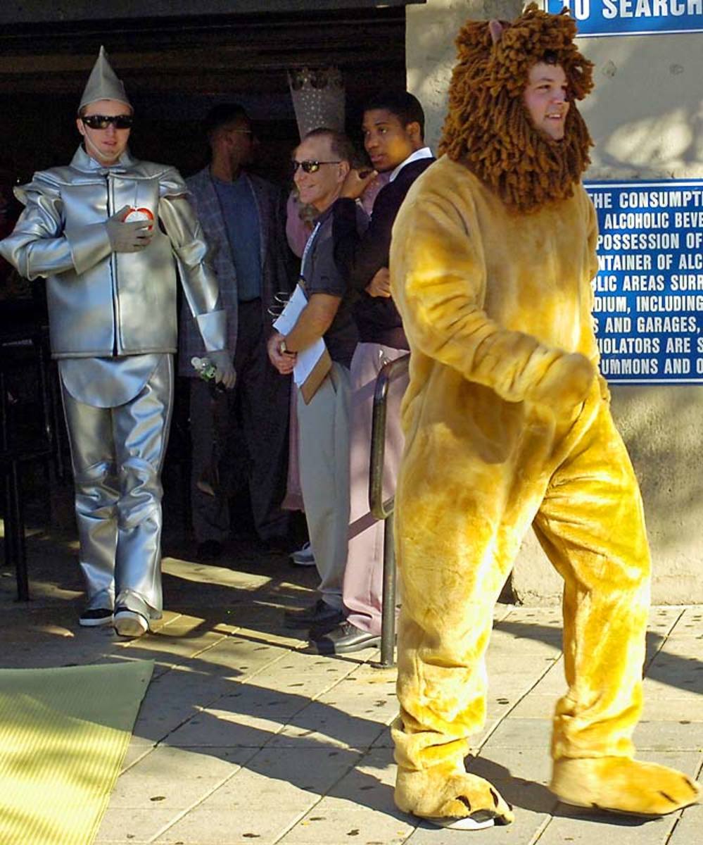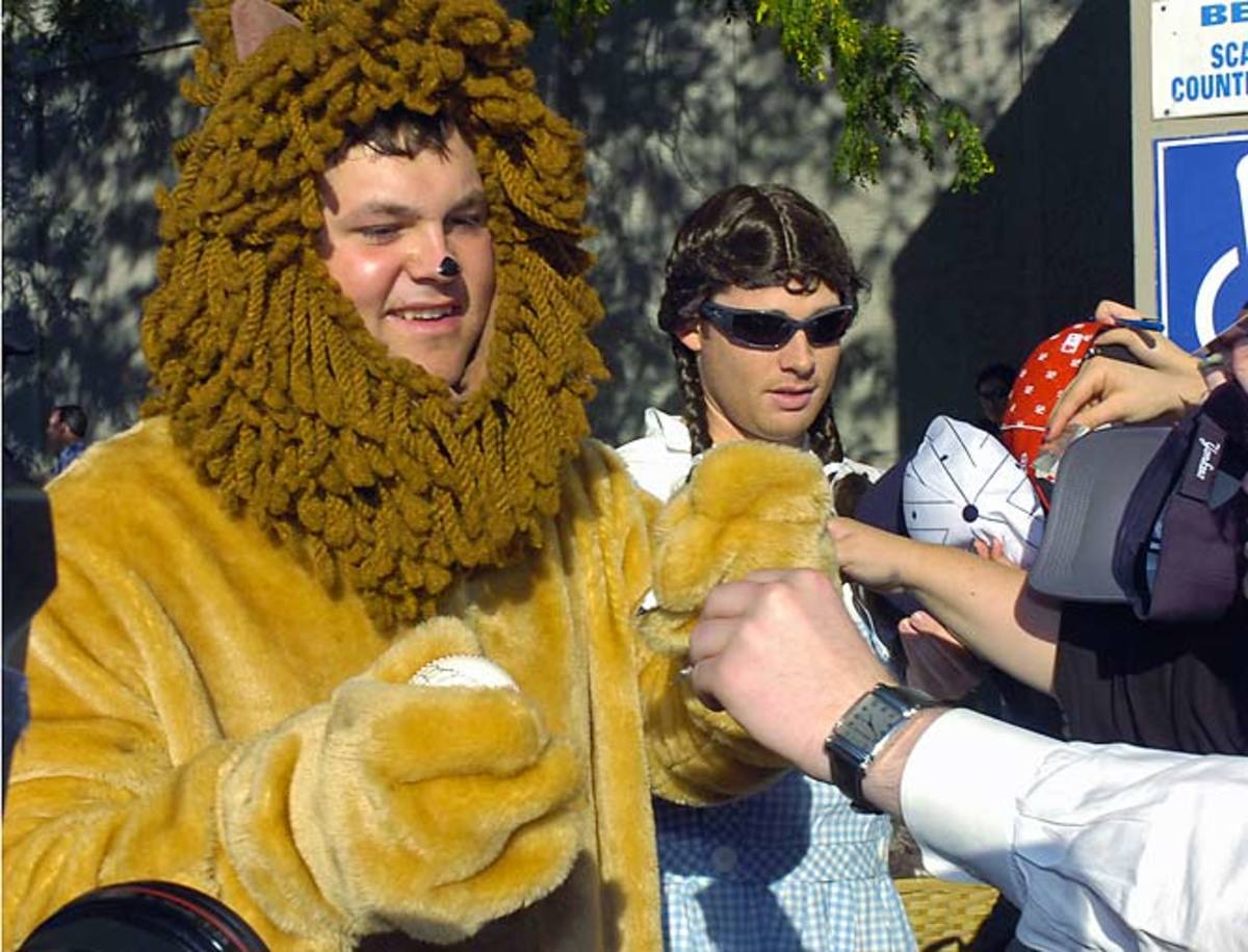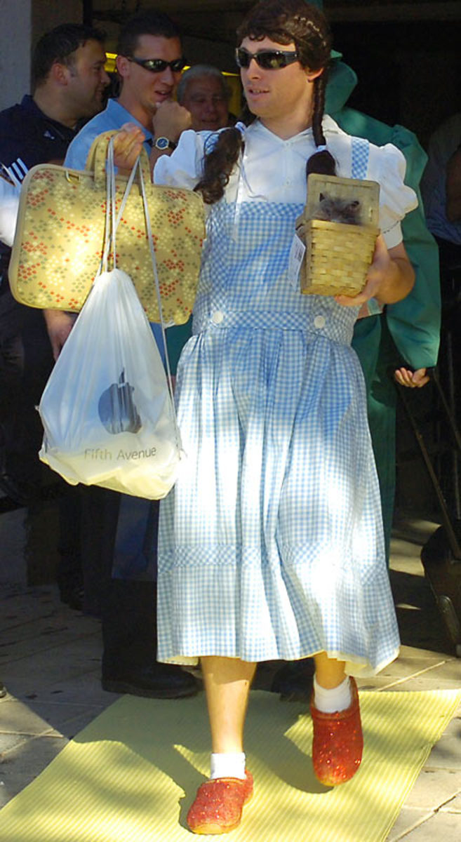 New York Yankees' Joba Chamberlain is dressed as the Lion, Ian Kennedy as Dorothy, Shelley Duncan as the Scarecrow and Phil Hughes as the Tin Man from "The Wizard of Oz" as they leave Yankee Stadium after Monday's game. The rookies had to dress in costumes as part of a hazing ritual before they left for a road trip.