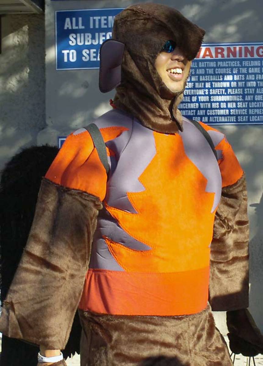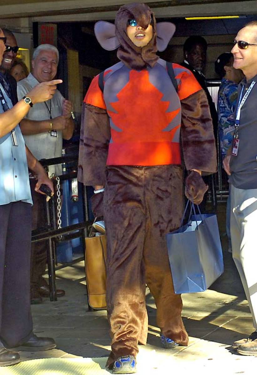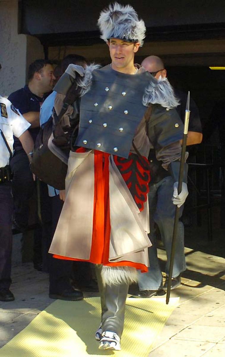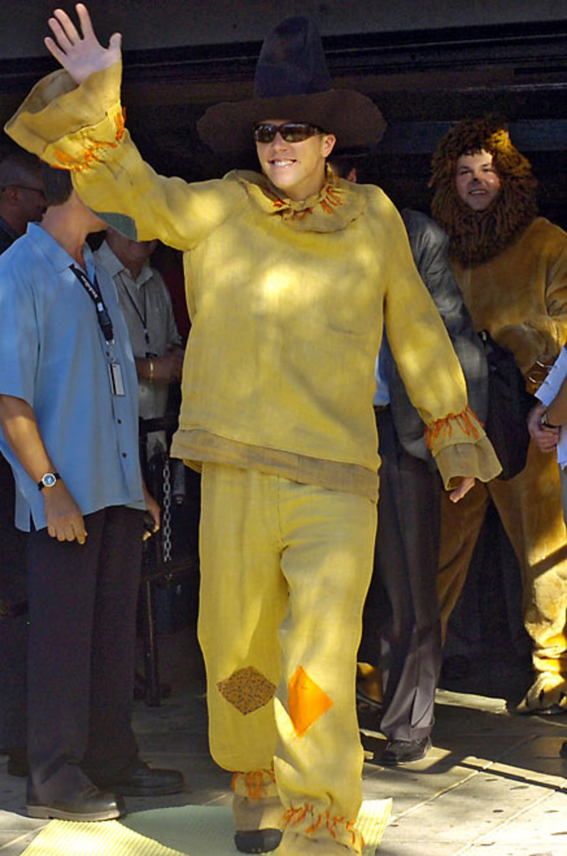 New York Yankees' Joba Chamberlain is dressed as the Lion, Ian Kennedy as Dorothy, Shelley Duncan as the Scarecrow and Phil Hughes as the Tin Man from "The Wizard of Oz" as they leave Yankee Stadium after Monday's game. The rookies had to dress in costumes as part of a hazing ritual before they left for a road trip.