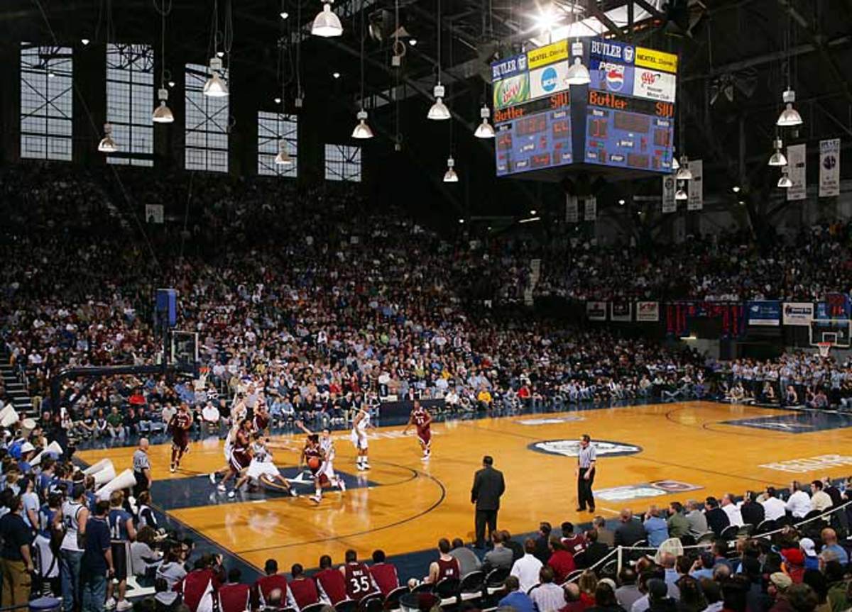 The setting can really enhance a picture, in this case Butler's Hinkle Fieldhouse in Indy, where the movie "Hoosiers" was filmed. The idea is to put a compelling sports action picture into a larger scene -- if run large enough, this can be quite effective.<br><br>Shot with: Canon EOS-1Ds Mark II, EF 35mm f/1.4 L USM, shot at 1/200 f/5.6