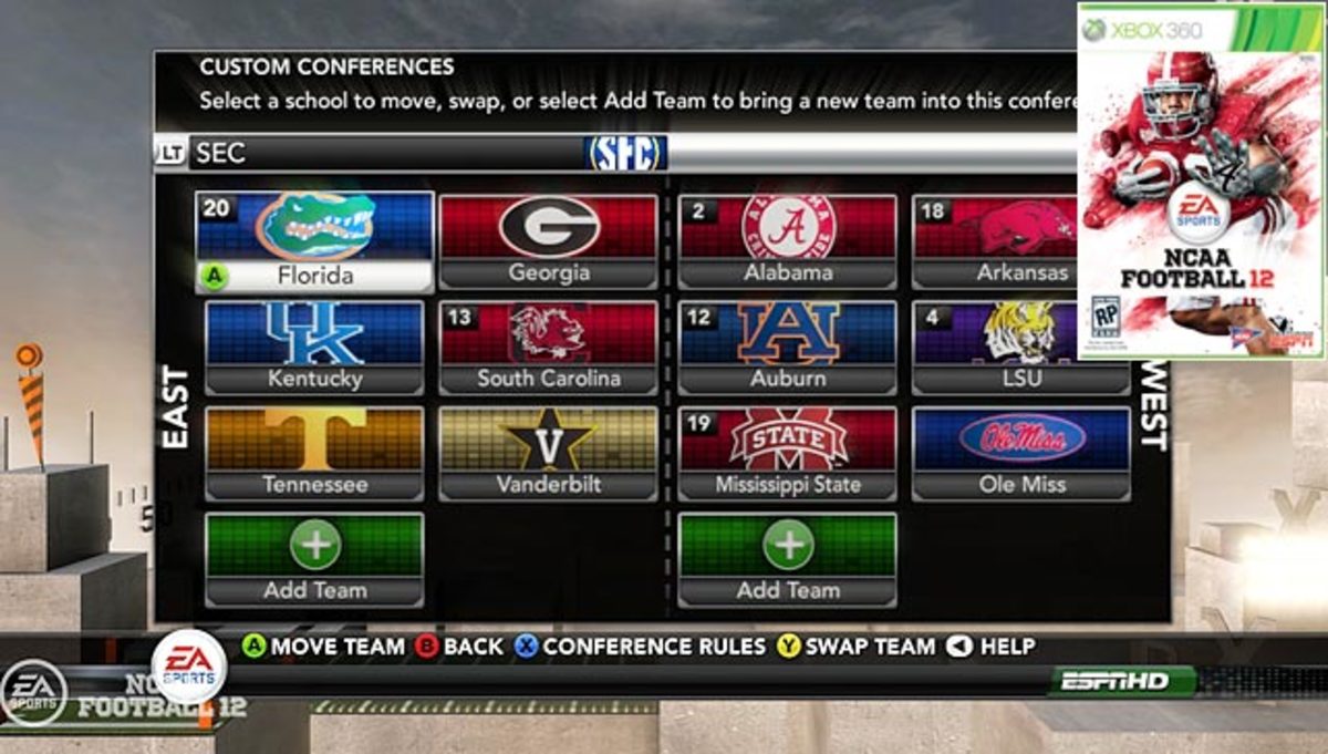 Conference realignment was a huge storyline last year, and the folks at EA were obviously paying attention. In NCAA Football 2012 they have added a new feature that allows you to reshape existing conferences. Want to create an SEC super conference with 16 teams? Want to make the Big 12 whole again? Want to kick USC out of the PAC-10? You can do it. NCAA Football 12 is scheduled for a July 12 release on the Xbox 360 and PS3.
