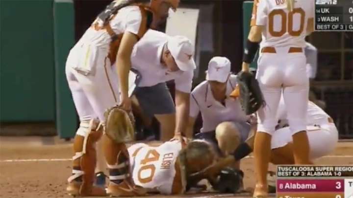 Texas pitcher Miranda Elish is "doing well" after she took a throw to the face in her team's NCAA softball super regional game against Alabama on Friday, the school announced on Twitter on Friday night.