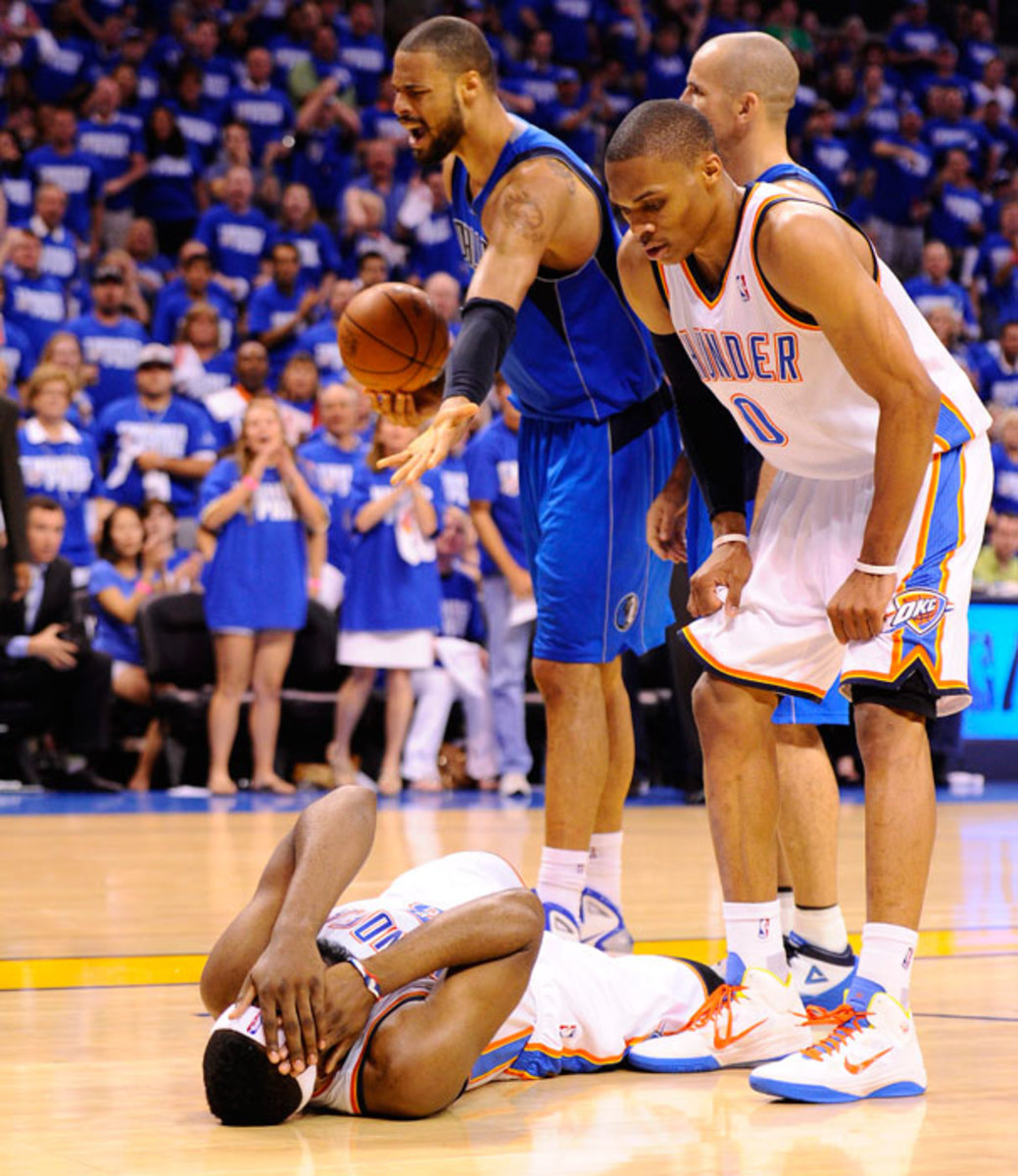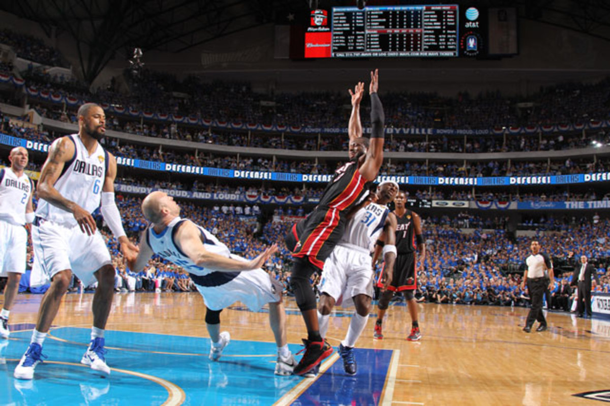 Cardinal continues to fall, Wade ... who knows what Wade is doing ... and Jason Terry is just in the wrong spot at the wrong time. But the best part about this play in the 2011 Finals: Jason Kidd, on the far left, just kinda standing there laughing at the whole scene.
