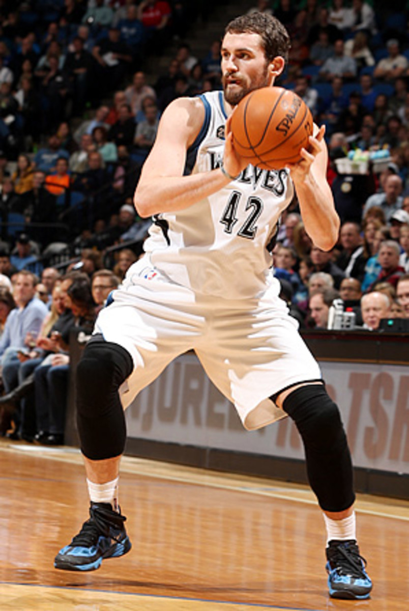 After the Mavs miss a layup, Martin can't connect on a floater in the lane. With his left arm Love is pushing 6' 6" Jae Crowder nearly out-of-bounds, but with his right hand Love delicately tips the ball off the backboard. Brewer corrals the rebound, and the T-Wolves reset. Love gets the ball back in the left block with Marion now guarding him. He turns to face him, takes two dribbles toward the baseline and then, with another pump-fake, gets Marion to leave his feet. As Marion flies by, Peter Pan-style, Love buries a one-footed fallaway from 15 feet. ("Yeah, I stole that one-footed move from Dirk.") In one sequence his unique skill set has been on display: savage strength, soft hands, textbook footwork, silky shooting touch, bulletproof confidence. The game, a 116-108 Minnesota win, is now essentially over.