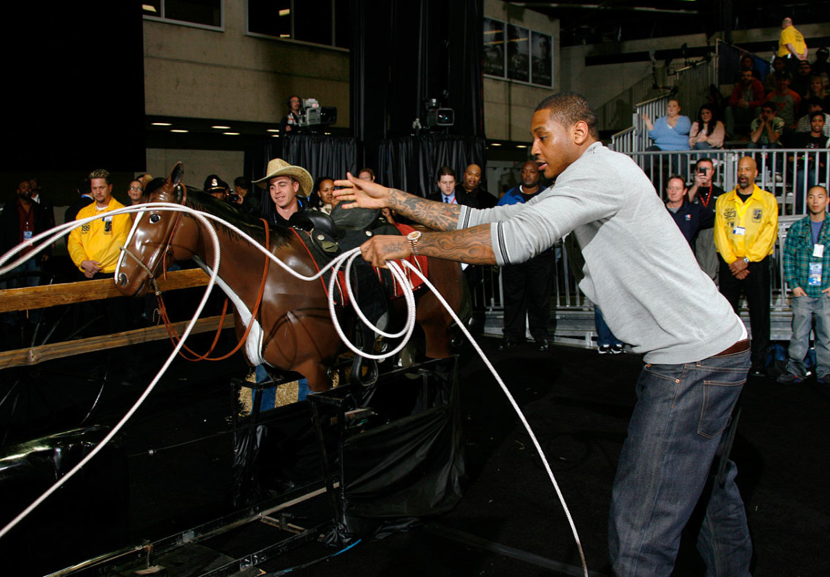Here's Carmelo roping a fake calf. Why? Because that's what people were doing at the 2010 All-Star Celebrity Game in Dallas.