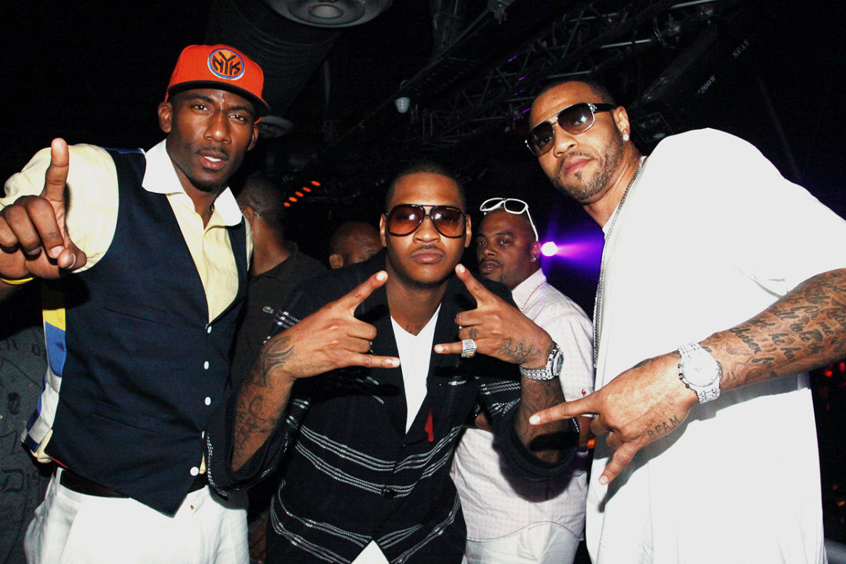 Pre-wedding festivities at Amnesia in New York City with Amar'e and Kenyon Martin. Pretty sure Amar'e is flashing a ''No. 1'' sign, but it's unclear what Carmelo and Martin are doing.