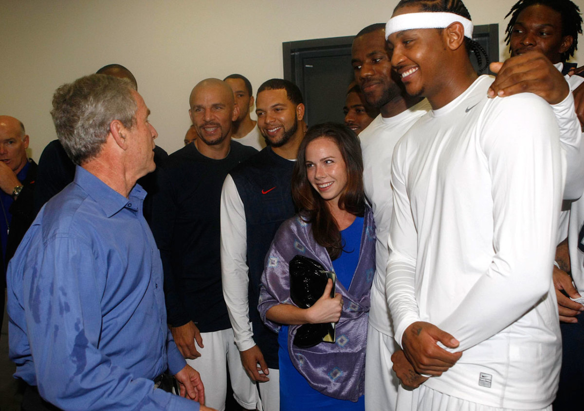 Jason Kidd, Kobe Bryant, Carmelo and LeBron attend the U.S. Olympic Men's Basketball Team unveiling of their new team look to fans in New York before they took off for the 2008 Games in Beijing. The ''Redeem Team'' defeated Spain in the final to capture the gold medal, ending an eight-year drought for the team at major international competitions.