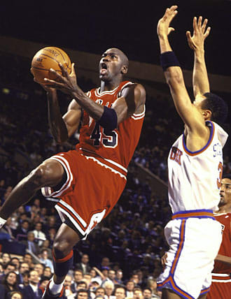 Midway through the quarter, on consecutive baskets, Jordan knocks down two shots that are mirror images of one another: He takes two dribbles to his right, soars and feathers in a jumper (10 points now), then takes two dribbles to his left, leaps and sinks another (13 and counting). It's as if he's a basketball camper doing station drills, and the Knicks scarcely exist.