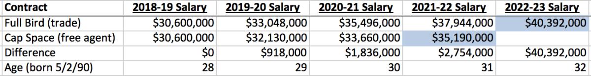 Alternatively, the Lakers could let this season play out and simply sign George as an unrestricted free agent next summer, presumably using cap space. One of the more significant differences between the two approaches comes in terms of the contracts the Lakers can offer. Here is the difference between the two potential deals, assuming George takes his maximum allowable salary and raises using the current $102 million cap estimate for the 2018–19 season with a final season player option:
