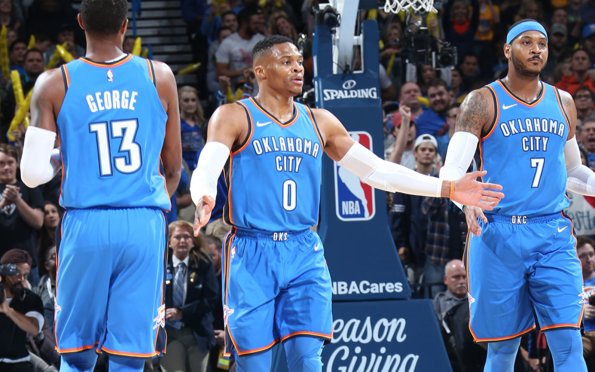 It's true that Harden has been unbelievable in Houston this year. While Westbrook has struggled, the Rockets just went 13–1 through November and Harden averaged 34.9 PPG to go with 10.1 APG. It's also true that supposedly overmatched OKC cast-offs like Victor Oladipo and Domantas Sabonis are thriving in a system that affords them more freedom, and all this is happening while supposed stars like Carmelo Anthony and Paul George struggle to find their footing next to Westbrook. You know what else is true? This year is not last year.