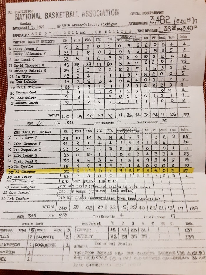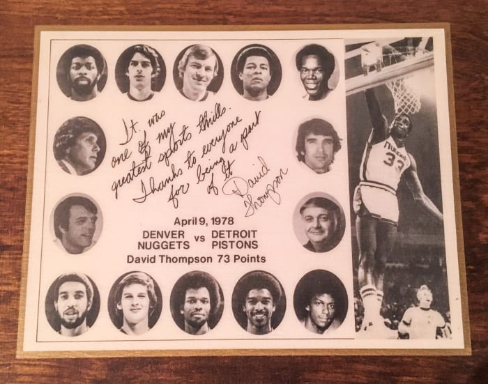 Tangible evidence of the NBA’s greatest scoring duel remains in other small forms. Skinner saved a photocopy of the stat sheet (though partly because he too had a career-high point total: 27). Ellis and several other former Nuggets still cherish a plaque that Thompson gave every player as an end-of-season gift to commemorate the performance. “It was one of my greatest sports thrills,” he wrote on the plaque. “Thanks to everyone for being a part of it.”