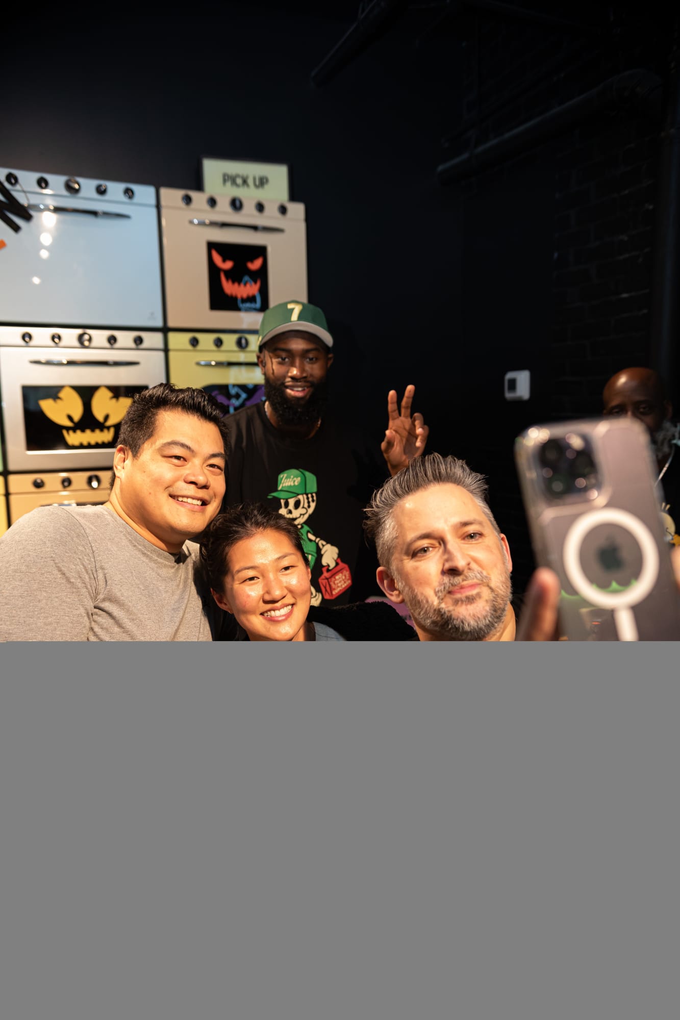 Jaylen Brown poses for a photo with fans with an assist from Johnny Cupcakes.