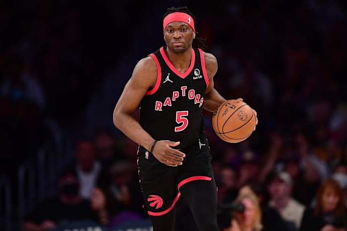 Toronto Raptors forward Precious Achiuwa (5) brings the ball up court against the Los Angeles Lakers during the first half at Crypto.com Arena.