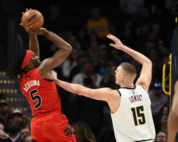 Denver Nuggets center Nikola Jokic (15) puts his hand on the chest of Toronto Raptors forward Precious Achiuwa (5) as he takes a shot during the first quarter at Ball Arena