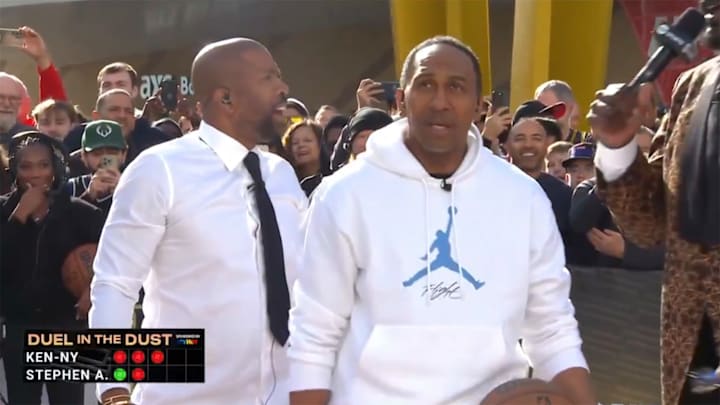 ESPN personality Stephen A. Smith joined the program in Las Vegas ahead of NBA Cup semifinal action Saturday, and he tipped off the show by facing analyst Kenny Smith in a free-throw shooting contest.