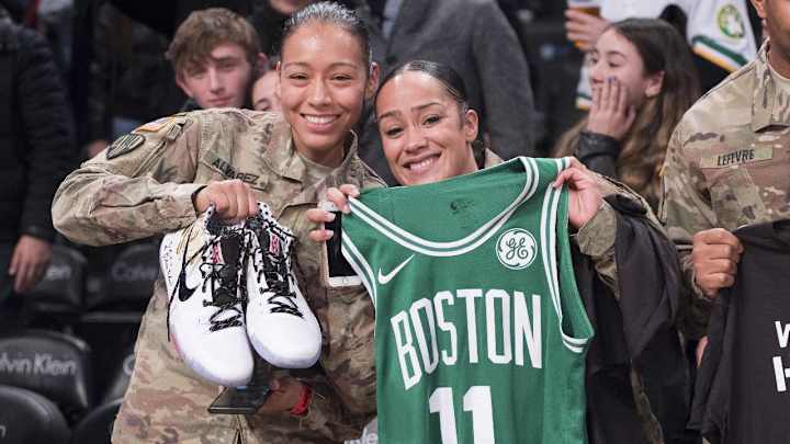 After beating the Nets Tuesday night, Kyrie Irving found two women in uniform who serve in the military and gave one his game-worn jersey and the other his shoes.