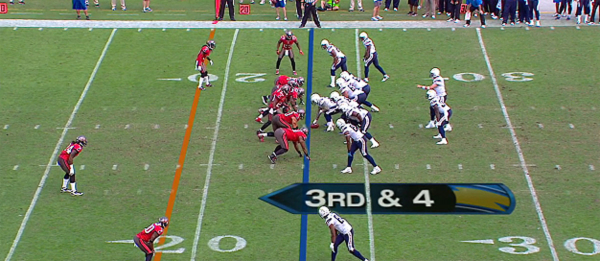 One example of this was the first of two interceptions he threw in the Chargers' 34-24 Week 10 loss to the Tampa Bay Buccaneers in 2012. San Diego had third-and-4 at the Tampa Bay 23-yard line with 13:42 left in the game, and Tampa Bay up, 24-21.