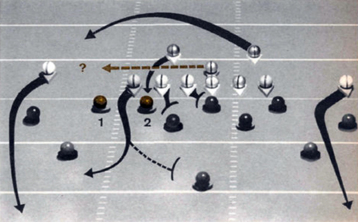If you run it Homer's way, the tackle gets optioned instead of blocked. You make that hulking soul worry about three things: a give to the runner, a keep by the quarterback or a pitchout. If you run it Houston's way, both the tackle and the end are optioned instead of blocked. Perhaps it should be called Somebody's Quadruple, because the quarterback can also pass as he goes veering down the line.