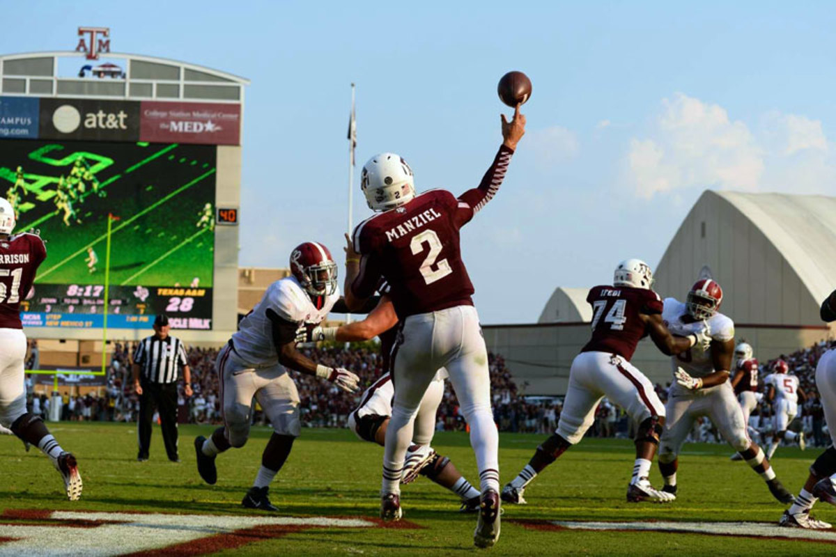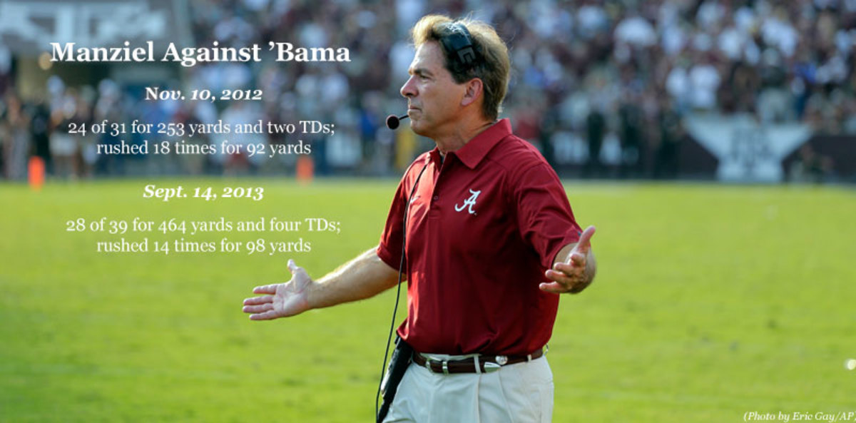 By the time it was over Manziel had racked up 562 total yards—second only in SEC annals to the 576 he had against Louisiana Tech last year—and the Crimson Tide had given up the most yards (628) in its mostly glorious 122-year history of playing the sport. Last November, Manziel handed Alabama its only loss, a 29-24 defeat at home in which he threw for 253 yards and two touchdowns and ran 18 times for 92 more yards. Forget about stopping him; Saban couldn’t even slow him down. Last weekend Manziel threw for 464 yards and four TDs, and added another 98 on the ground.