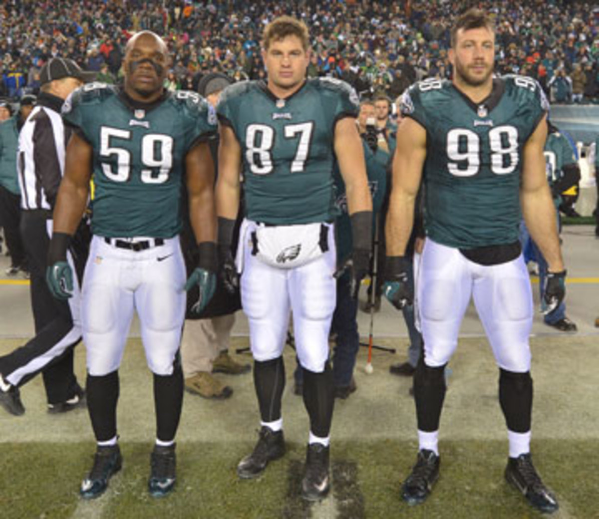 DeMeco Ryans, Brent Celek and Connor Barwin, Philly’s captains for the January playoff game against the Saints. (Drew Hallowell/Getty Images)