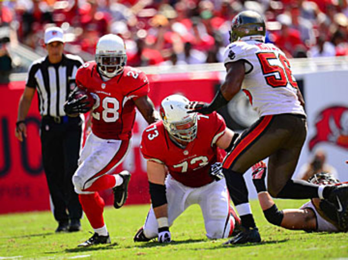 Cardinals right tackle Eric Winston (73) picks himself up after making one cut block to take on a Bucs linebacker. (Al Tielemans/SI/The MMQB)