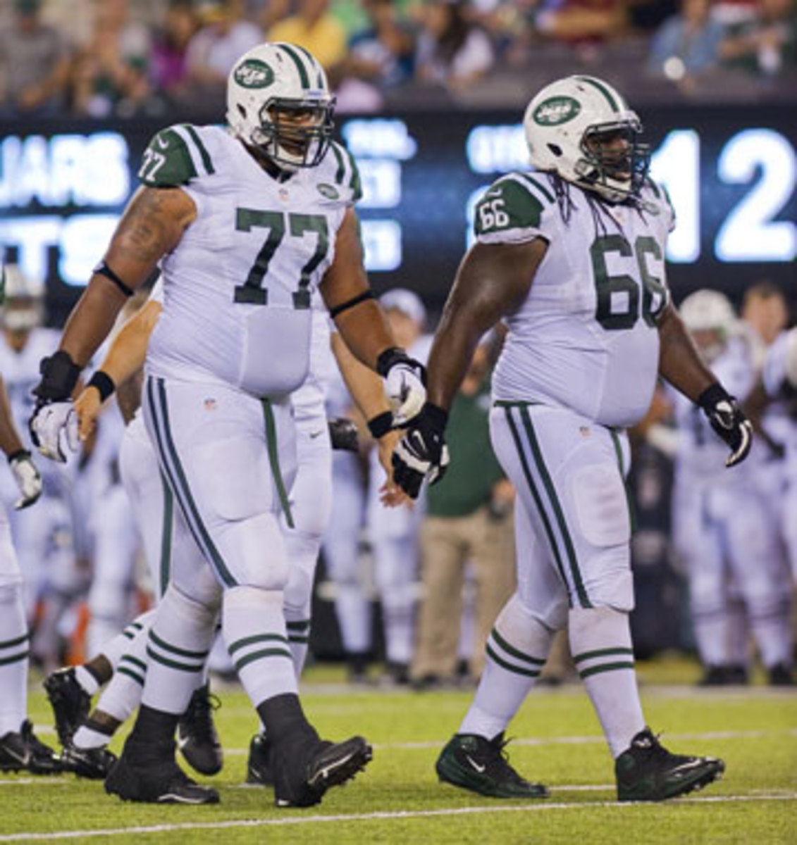 Jets tackle Austin Howard (77) and guard Willie Colon executed a perfect “squeeze” block against the Falcons in Week 5. (Duncan Williams/Cal Sports Agency)