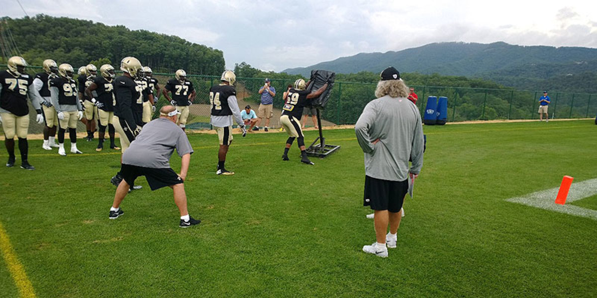 The scene: First padded Saints practice of camp … Sunday morning, 9:19 a.m. … defensive line group in the southwestern end of the brand-new field at The Greenbrier … grass like an Augusta fairway (and I’m not kidding) … cool morning, about 71 … storm clouds rolling in from the west, white cumulus ones interrupted by the Allegheny Mountains—in fact clouding the view of the homes of Nick Faldo and Jerry West … the nine-man defensive-line group stretching and warming up before hitting someone else for the first time since January.