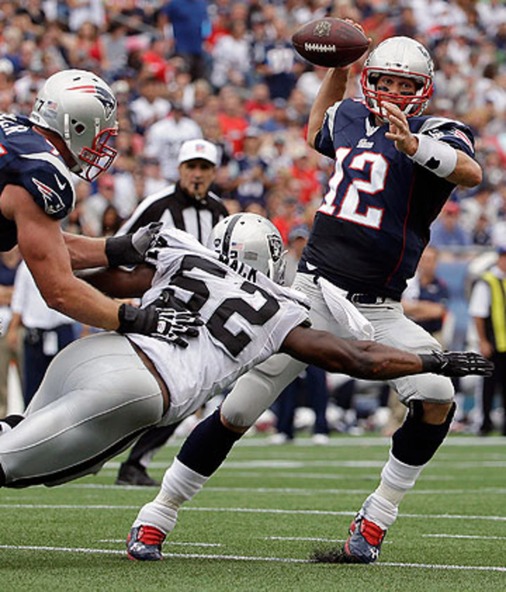 • Charles Woodson returns to the scene of the crime. How often can you say the main characters in a football game are the same for the rematch 13 years later? It’s been 13 seasons since the infamous Tuck Rule game, the overtime win in the 2001 playoffs in which the Patriots were aided and abetted by ref Walt Coleman negating what appeared to be Woodson’s game-clinching strip sack of Tom Brady. On review, Coleman ruled that Brady was tucking the ball away and therefore it constituted an incomplete pass; the Patriots retained possession, won in overtime, and went on to their first Super Bowl under Bill Belichick. The Raiders never forgot. So four months shy of the game’s 13th anniversary, the two teams met again in Foxboro. Lots of changes (“The starting Oakland wide receivers that day were Jerry Rice and Tim Brown," my NBC stats partner, Elliott Kalb, pointed out), but there was Woodson, chasing New England receivers and chasing Brady too. A lot of similarities between the games too. The Patriots, both times, scored 16 points in a win (16-13 then, 16-9 now), Woodson was productive in defeat (five tackles and a pass defensed then, four tackles and two passes defensed now) and Sebastian Janikowski kicked multiple field goals in both games (two in the playoff game, three on Sunday).