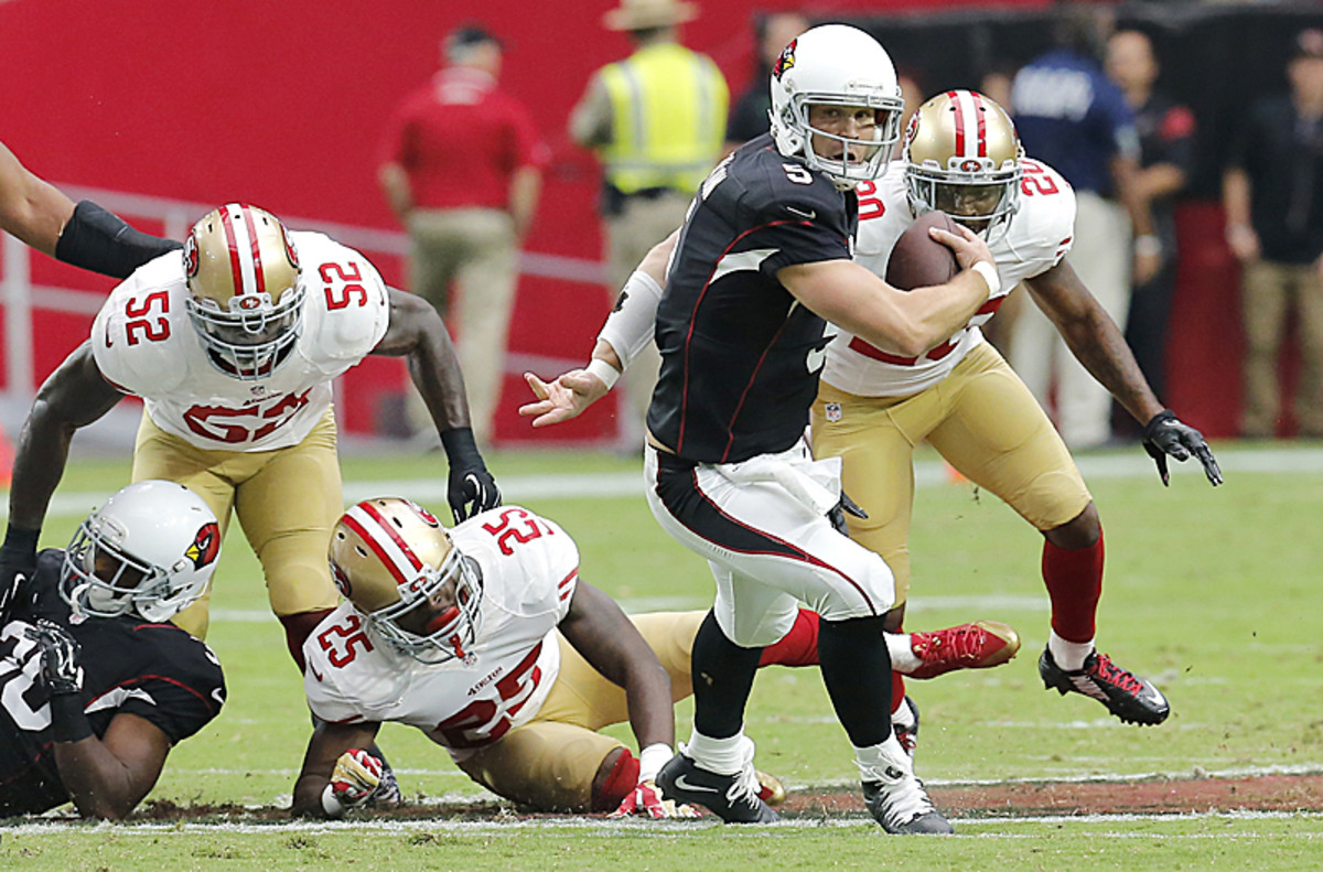 He’d never have been on the sideline as the final seconds ticked off the clock on Sunday, with the crowd in Glendale roaring, Stanton and the Cardinals having broken the 49ers’ hold on them. San Francisco had won nine of the previous 10 games against Arizona. The Cards were down 14-6 early in the third quarter, and Stanton was getting cuffed around by the Niners’ rush. But on consecutive series he completed five of seven throws and took advantage of rookie John Brown’s quickness at the line of scrimmage. Brown, the third-round pick from Pittsburg (Kans.) State, twice beat jams at the line; he’s clearly one of the quickest receivers in the league. And Stanton found him twice downfield, once mismatched against a safety, and hit him for 24- and 21-yard touchdowns.