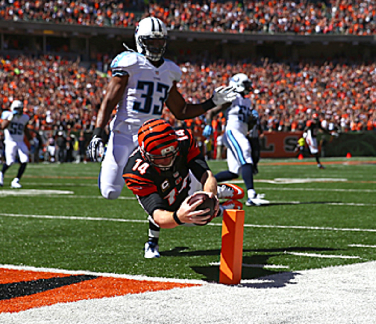 In this case, the play that illustrates Jackson’s touch with the offense is the last play of the first quarter, at the Tennessee 18-yard line. Dalton handed it to wide receiver Mohamed Sanu, lined up in the backfield, and Sanu took off to the right while Dalton slunk off to the left. Sanu is becoming something of a legend for his throwing prowess, but he launched a pass to Dalton with a little too much air under it. As the ball came down, Titans corner Blidi Wreh-Wilson bore down on Dalton, looking like he’d either pick off the floater or level Dalton. He did neither. Dalton caught the ball, turned toward the goal line and dove in for the first touchdown reception of his pro career.
