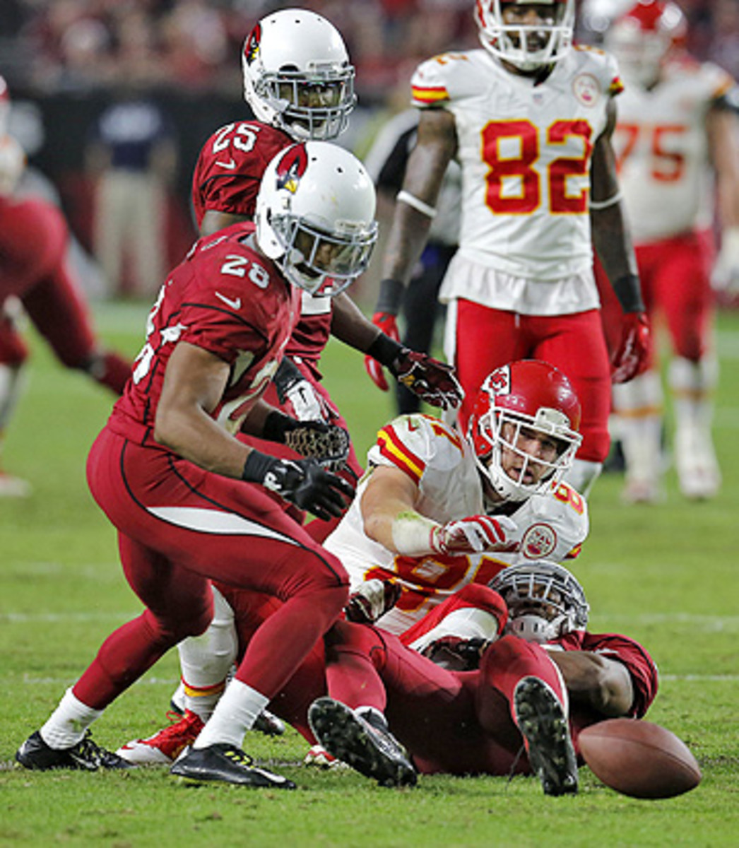 The one call of the day I just couldn’t fathom. Arizona 17, Kansas City 14, 5:31 to play in the fourth quarter, Chiefs driving for the tying or go-ahead points in a crucial game with playoff implications—for both teams. Alex Smith throws to tight end Travis Kelce, and he advances the ball to the Arizona 22. Field-goal range now. At end of the play, Arizona safety Deone Bucannon rides Kelce to the turf. Just before Kelce hits the ground, the ball moves—but is not dislodged—in his grasp. Kelce hits the ground, is ridden over on his side, and the ball pops free. The Cards recover, but it appears to be the end of the play, with Kansas City keeping possession, and the whistle blows, so Arizona doesn’t advance the ball. I watched four different angles. There is no way you can tell that the ball is out of Kelce’s possession when his knee hits the ground and he is down. No way. Yet ref Craig Wrolstad went under the hood, and after consulting with the New York replay center, came out and reversed the ruling on the field. Calls should change only when replays show with 100 percent certainty that the call should be changed. And it is inconceivable that Wrolstad could be 100 percent that Kelce had lost possession before his knee contacted the ground. The replay center has worked well this year and improved the consistency of replay reviews overall—without question. But that call in Arizona was a major gaffe … and the Chiefs will have a beef if this game costs them a playoff berth.