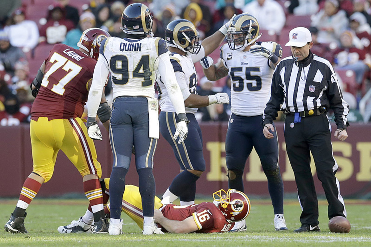 b. Speaking of a terrible block, Washington left tackle Trent Williams giving up on a block that got quarterback Colt McCoy unfairly nailed.