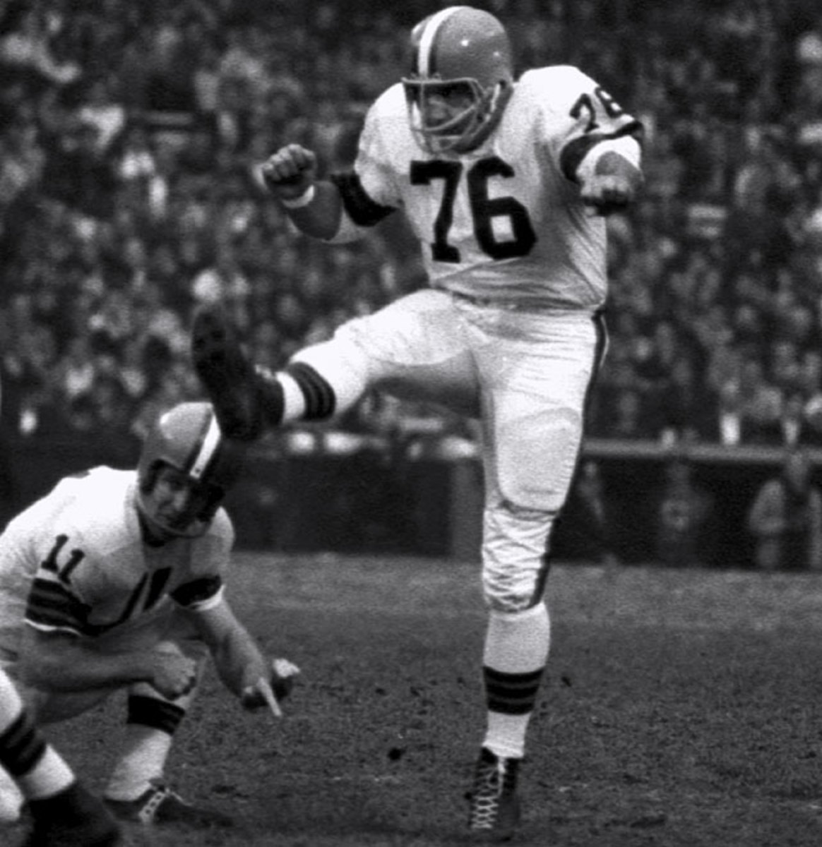 Lou Groza and the Browns grew up together. He joined Cleveland as a 22-year-old tackle and kicker in its debut season of 1946, helped it dominate the AAFC with four championships in four years, and then played in six straight NFL title games from 1950-55, winning three of them. Groza kicked the last-second clincher in a 30-28 win over the Rams in the 1950 NFL title game. He and the Browns enjoyed their last hurrah in 1964. Groza, at 40, was a kicking specialist and booted 22 of 33 field goals in 1964, adding two more in Cleveland's 27-0- whitewashing of the Colts in the championship game. It was Cleveland's last championship. Groza held on for three more years, retiring at 43. The Browns appeared in 13 pro football title games with Groza and zero without him.